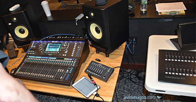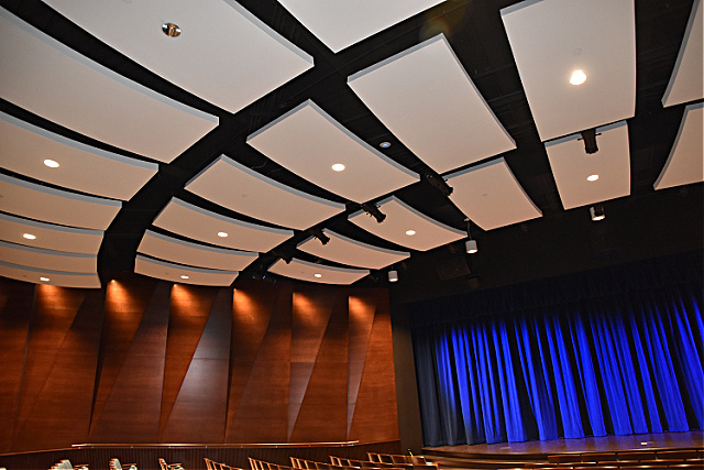 Acoustically, the challenge with this uniquely designed edifice – affectionately nicknamed “The Egg” – was to not allow the curves to generate echoes and other focused sound effects within the room. This was done with a variety of acoustically diffusive hard panels on the sidewalls and absorptive panels on the rear walls, working in conjunction with ceiling clouds to prevent focused energy and provide a good speech intelligibility into the seating area. The room is comprised of several types of systems: Audio: In order to be user friendly for the visiting performance groups, we incorporated a versatile digital audio setup with the capability of bringing in analog audio consoles and/or guest digital consoles that can tie in directly to the systems. Now any group coming in can use the in-house Allen and Heath systems, or it will work for them to be able to use their own. Lighting: This is all LED color changing and incorporates a variety of fixtures for a variety of purposes. Rigging: There is a dead-hung stage rigging system, including a motorized main curtain that closes across the curved front of the stage. Video: The room incorporates high-definition video projection, cameras, and other systems.