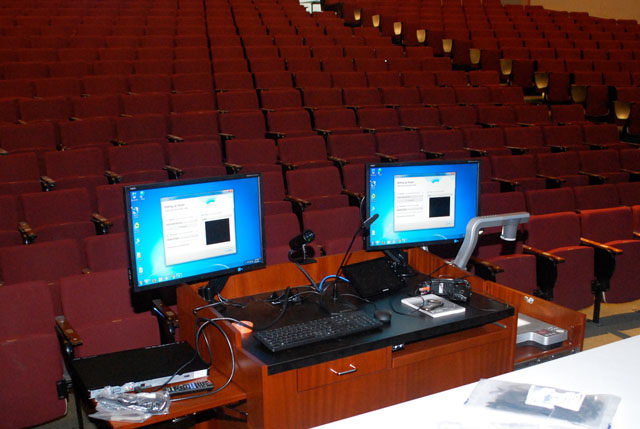 Kennedy Hall – a large lecture space – is a heavily booked venue at Cornell University in Ithaca NY that must accommodate many types of AV presentations. Individual professors had been bringing in a myriad of portable equipment to meet their needs. This necessitated a significant amount of support for the room for each use and set up. The goal of the project was to consolidate all of the needs into one system with a user interface that would minimize the need for technical assistance. A series of meetings were held to determine the requirement for the systems, budgets, and general goals for the look and feel of the space. Multi-image capability was a common theme and a variety of scenarios were explored to provide for this capability. A key decision was made to utilize one very large fixed screen instead of multiple smaller motorized screens for multi image capabilities. Using digitally mapped projectors, the system can create one very large very bright image, or multiple images in a variety of screen sizes. The use of dual overlapping projectors also provides redundancy in case of failure. The final design included LED presenter lighting, digital audio controls,audio systems, HD video with multi image processors, streaming, capture, and video conference capabilities.