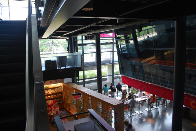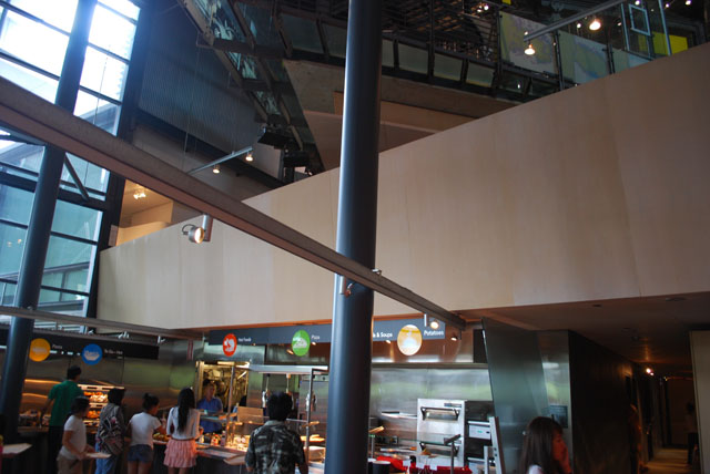Being a museum of glass, Corning has a lot of glass! When an expansion was undertaken to add a restaurant and store area, the museum decided to take measures to reduce sound level in this busy venue. While there are many glass surfaces, there were also many surfaces that could be treated. Field testing was performed to verify existing conditions. A computer model was implemented to verify the results possible by treating the surfaces that could be treated. The design target was a reverberation reduction of 4 seconds. Wall surfaces, ceiling areas, and other solid surfaces were treated with acoustically absorbent materials that mimic the look of standard materials. Decorative banners were also added to absorb even more sound. While the space is still live (After all, it still has a lot of glass!) the overall reverberation has been reduced significantly.