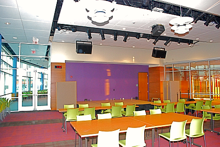 AVL was contracted to provide design services for a large multipurpose space at Finger Lakes Community college. The space is truly multipurpose being used for classes, media presentations, awards ceremonies and musical events. This facility has many users of varying skill levels. A multitier control system was implemented allowing each users group to access what they needed, and not be burdened with controls they did not need for their application. Audio, lighting, and video capabilities range from almost automated for some users, to operator-based controls for more complex events. An adjoining dining space is connected for expansion spaces via audio and video when larger events exceed the capacity of the primary room.
