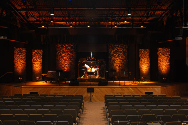 Lakeshore Community is a non denominational church that wanted to upgrade the quality of their In sanctuary systems to accommodate a higher level of technical presentation. AVL was contracted over a period of years to provide design for various upgrades. The first was correction of the room acoustics. Due to its shape, the sanctuary had significant sound energy reflecting back into the seating area negatively affecting listeners. A budget-conscious design using wall mounted absorbers and diffusors in a binary layout were used to control the percentages of energy required to control these reflections. Panels of varying types were used to tune the room reverberation to a flatter overall response, removing midrange peaks. The next project was a replacement sound system. Main speakers, DSP, console, and stage monitoring were all replaced in a renovation that moved the worship department into new territory. In ear monitoring added to overall audio control, and the resulting audio quality into the seating area was dramatically improved. The next project was a lighting upgrade. The original system was all incandescent with poor lighting locations and no color or other interest. AVL designed a new rigid lighting grid incorporating color changing LED technology as well a new quartz lighting. The system provides dramatic backdrops for worship and preaching. The final upgrade was new video projection and controls. A three projector system with independent switching and mixing of video images for each screen was implemented.