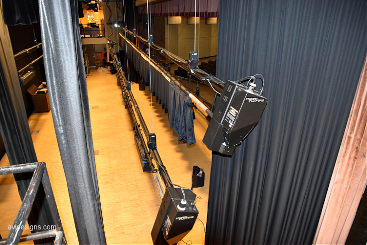 AVL Designs Inc.’s first task was to design new stage rigging which would be up to current stands and with as many moving pipes as possible. AVL utilized ETC FlyPipes to accomplish this task. A self-climbing package hoist allowed us to provide a safe, moving solution. The control of lighting and studio was in the balcony, which is not a great location for running a show, so a new control booth was included on the main floor to allow the audio and lighting crew to experience the show from the audience’s perspective. New AV systems included main speakers with over and under balcony delays to fill shadowed areas. A new digital console, wireless microphones, projector and screen, and controls were also included.