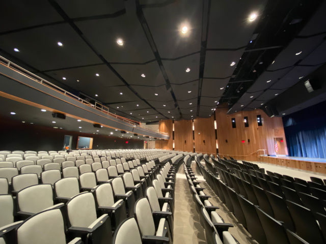 This major renovation meant enlarging the entire auditorium, refurbing the music department and adding some additional rehearsal spaces. Working along with the architects, our plan was to include electronic acoustics in many locations. It would not only be the in the auditorium and on the stage, but also in the large rehearsal rooms for orchestra, band and choral ensembles. Singers and musicians would then be able to rehearse in environments similar to what they would experience in the auditorium. That became the initial driving force for the acoustical design. We had to look at how to treat the main auditorium to get the reverb time low enough and flat enough that when we implement the electronic acoustics, there will not be significant problems with frequency balance and reverberation curves. The electronic acoustics system is based on Yamaha acoustic field correction devices. It is implemented with speakers located onstage, in overhead ceilings, in under-balcony ceilings, and on sidewalls. These systems are providing reverberation as well as early reflection support for the room. The system can also add voice lift to allow for events without sound reinforcement. The auditorium was being dramatically enlarged, shaped with curved walls plus adding a balcony. To deal with that condition we developed a custom absorptive diffusive wall treatment. It consists of series of wells of different depths with perforated materials and solid materials, creating a diffuse sound field within the auditorium and generating a relatively low reverberation time for the size of the room. This design criteria was also used for the music spaces to produce similar reverberation curves for their base conditions. That way, when the electronic systems are commissioned, there will be tunings for each space that will mimic each other to the degree that you can mimic a smaller space to a larger space. In addition to the electronic acoustics and physical acoustic designs for this auditorium, AVL Designs Inc. was contracted for stage rigging, theatrical and house lighting, and sound and video in the space. One of the unusual features of the room is the incorporation of Danley Jericho loudspeakers. The Jerichos look huge and indeed are huge, but they are actually a replacement for line array technology that many auditoriums would implement, at a lower cost and a higher performance level. The Jericho combines a large number of drivers in a single large enclosure, creating an output pattern and sound pressure capability similar to a 12 element tall, mid to large scale line array. Admittedly, it looks a little odd to have boxes this big in a high school auditorium however the pattern control over the wide frequency range of the speaker allows it to cover most of the main floor as well as the balcony without the need for other devices. We also installed over and under-balcony delay fill speakers. This was primarily for potential special effects for theater use, and also to add the few frequencies that would be missing as you go by distance to the back of the room. The audio system is fitted with an Allen and Heath D Live console, which is a substitute for a Yamaha console originally specified. (Due to Covid issues the Yamaha console is not currently available) The D Live is a great console and will do a fantastic job for the school in the new application. Theatrical lighting consists primarily of Electronic Theater Control products and High End systems, with some Strand and Phillips fixtures as well. Stage rigging is a combination of Brick House counterweights and Electronic Theater Controls Prodigy hoists. The Prodigy hoists are used for onstage electrics, as well as a front of house moving head electric. All of the music rooms are used as green rooms, so we have a combination of intercom, call lights, and video feeds to each of those spaces from the main auditorium. The transformation from the original room to what it is now is dramatic.