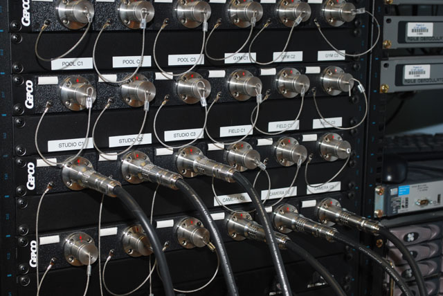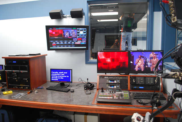 AVL was contracted by the Palmyra Macedon School District (PALMAC) to design new television studio facilities to allow both studio shooting and on site sports shooting live to air. Distances between the various sports venues (football field, gymnasiums, pool) and the studio exceeded 1500 feet. A fiber optic solution needed to be adopted to manage the long distances. Another requirement was to allow for on field live post game interviews with IFB fold back to the talent so they could hear prompting from the studio as well as confidence monitoring of the microphones in use. This was accomplished with digital audio connections from the studio to the remote locations with Aviom remote controls on the field end. Digital Fiber Optic Camera systems Green Screen 3D Studio with Hard Cyc Green Screen Weather Set Teleprompters and Confidence Monitors Live Sports Graphics Offline GFX Broadcast Pix Switcher Studio Pipe Grid and Lighting control Audio including IFB Fiber optic connection to multiple venues with IFB and remote monitor for cameras Building wide IP distribution Direct connection