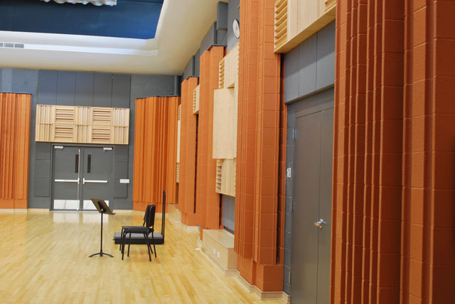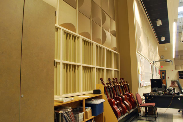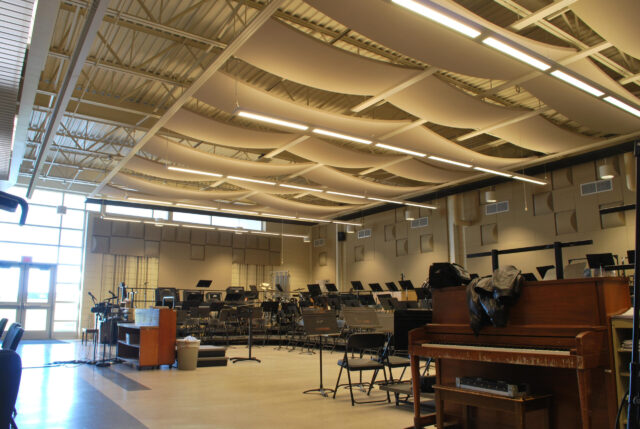 In the design phase of multiple rehearsal spaces for the Phoenix Central School District, the architect wanted a dramatic look along with good acoustical conditions. The budget they had to work with was somewhat tight. We used a combination of off-the-shelf wall products and a custom GRG acoustical canopy for each space. The acoustical canopy allows energy to be distributed back to the musicians while some of it is generated up to an acoustic roof deck above. Walls products include diaphragmatic units that help control low frequencies. A combination of RPG formed fussors as well as kinetics barrel diffusers and absorbers of various thicknesses were used to tune the rooms.