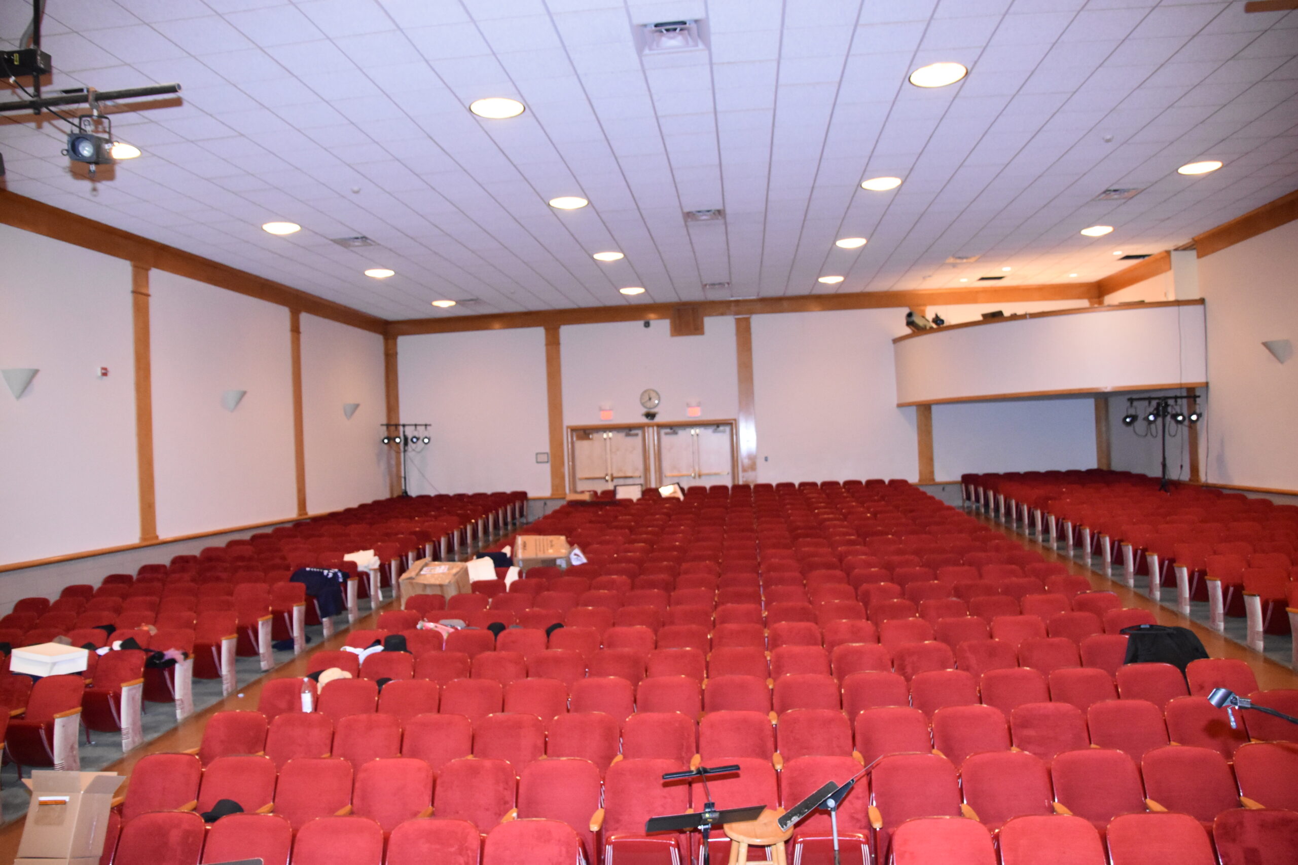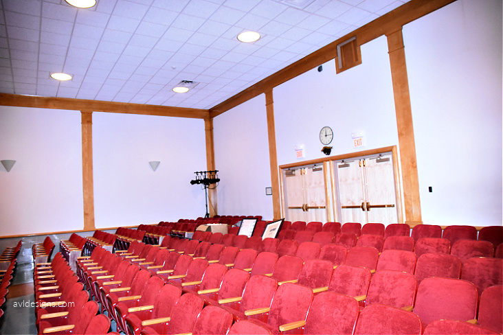 AVL Designs Inc. was contracted by the architects, the CPL Team, to provide theater design or updates of the space. First and foremost was the addition of a full balcony. This was no small trick as the space is quite low and budgets did not support raising the roof. The final design, unusual in nature, works very well. An empty space under the balcony structure provides an environment that is acoustically more open, even though the front edge is low. Under-balcony lighting was also a challenge and required using an atypical fixture. Stage rigging also required unique options, as the height is quite low. Innovative rolling track wing masking, a motorized Cyc rollup system, and other features provide a far more useable stage area. A front-of-house motorized truss has been added to make lighting more accessible, as opposed to the prior dead hung pipe system. Sidewall torms have been added to light the floor in front of the stage for choral and other uses. The room has been acoustically enhanced by raising the reverberation time and balancing the frequency response. This has been accomplished almost invisibly within the architectural design.